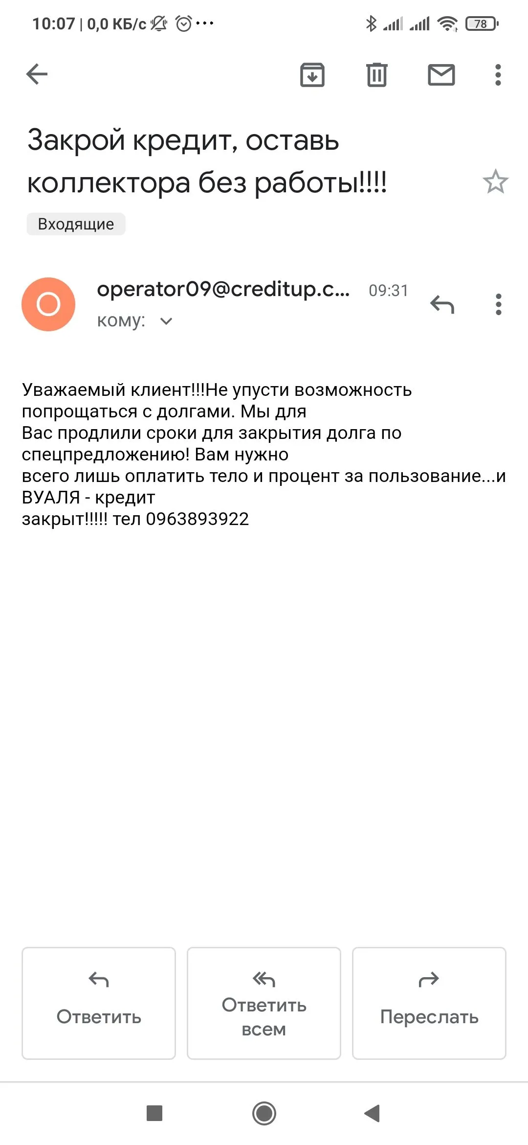 Мне сегодня такое прислали ?А мені на пошту надійшов від них лист, що я вкрала у них тіло кредиту, не виходжу на зв'язок і взагалі зникла. А 1 грудня до мене в село, де я проживаю приїде виїзна комісія щоб описати моє майно і вилучити. Ну і ще купа статтей мені приписують. Буду чекати.