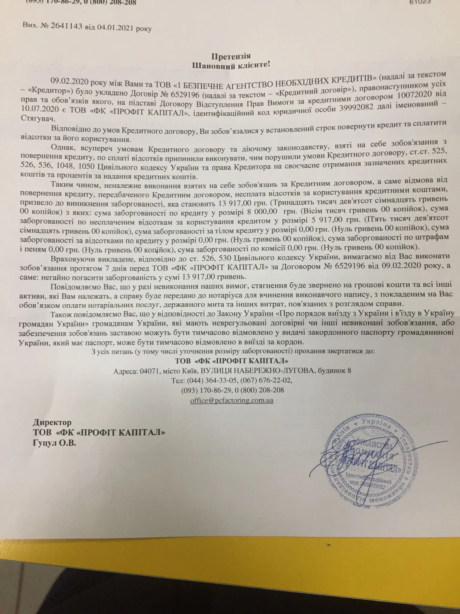 Сьогодні отримав від Вас листа з незрозумілим змістом! Якісь незрозумілі вимоги та повідомлення без особистих підписів та мокрих печаток!?? А також погрози вчинити незаконний виконавчий напис нотаріуса на беззаставному і неповіреному нотаріально кредитному договорі, та й договору, власне, не існує!!! Тому повідомляю вам, що:
