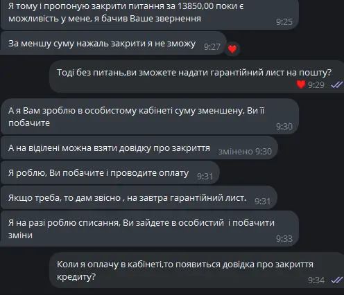 Це не зовсім гарантійний лист. Але я їх закривав через особистий кабінет. Після оплати в кабінеті кредит закрили. І після звернення до них також надали довідку про закриття кредиту. Також пропонували зайти на відділення,щоб отримати паперову довідку.