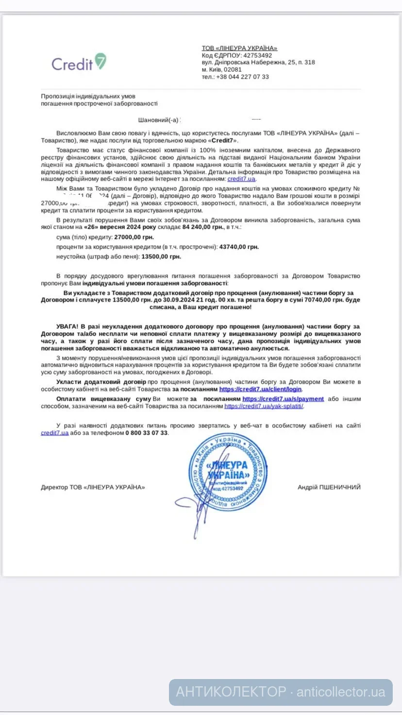 по Кредит 7 38 день протермінування,Тіло 10тис . Минулого тижня бєшений Віктор він же Євгєній, він же Ігор тероризував мене у вайбері,прям неадекват,на тіло не погоджувася. Тому я закрила інший кредит. А вчора його попустило пише закривайте кредит за 10500,00 . А в мене вільних коштів нема. і до кінця місяця не буде. Надіюся що запропонують ще за тіло а то і за пів:) спілкуватися з ним не має бажання. бо він мені робить нерви не люблю істеричних людей