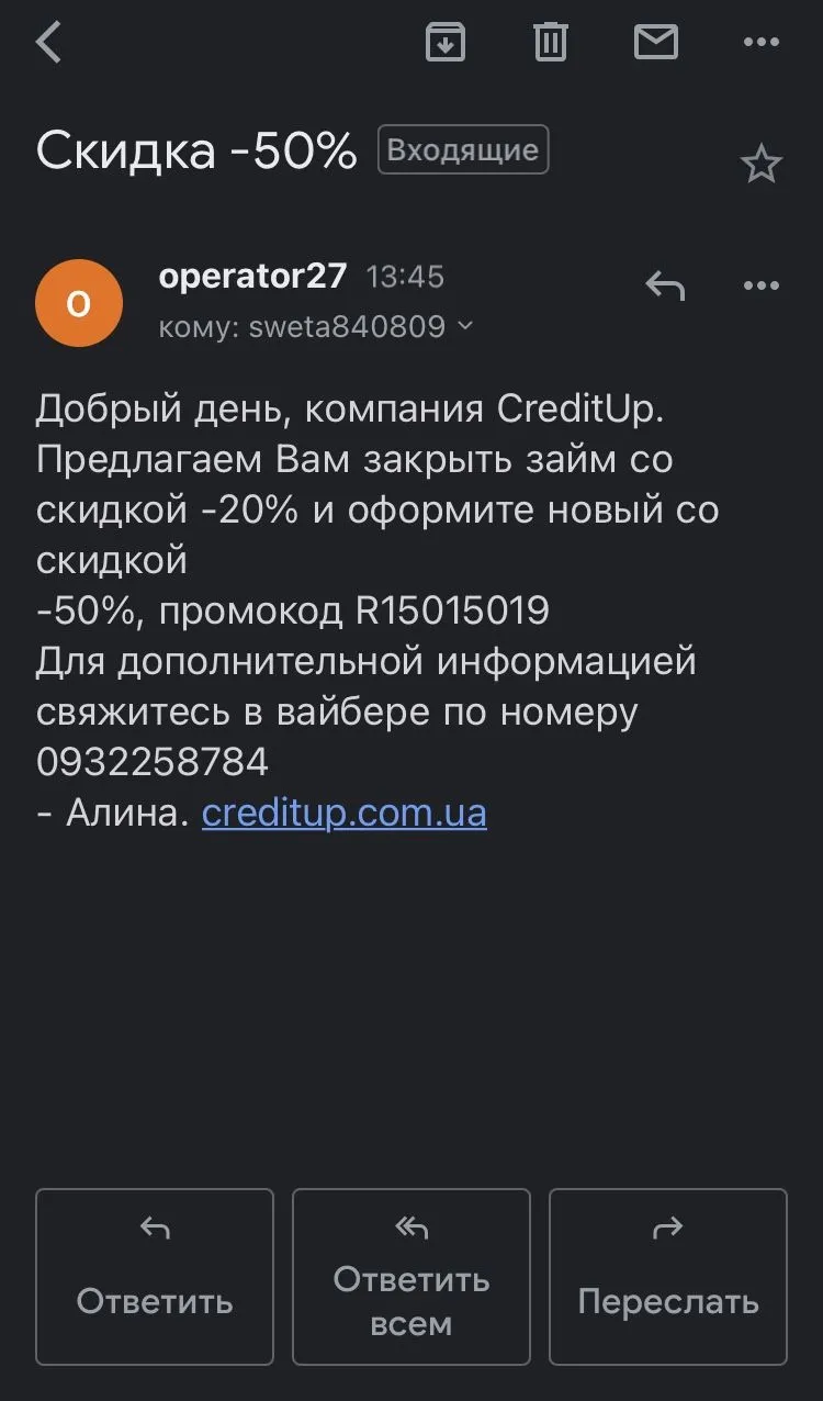 Брала кредит в кредит ап. Просрочка 42 дня. После просрочки не было ни звонков ни смс. Вчера только на почту прислали письмо «Оплатите свой долг, по скидке -40%» акция действует до 14.01.