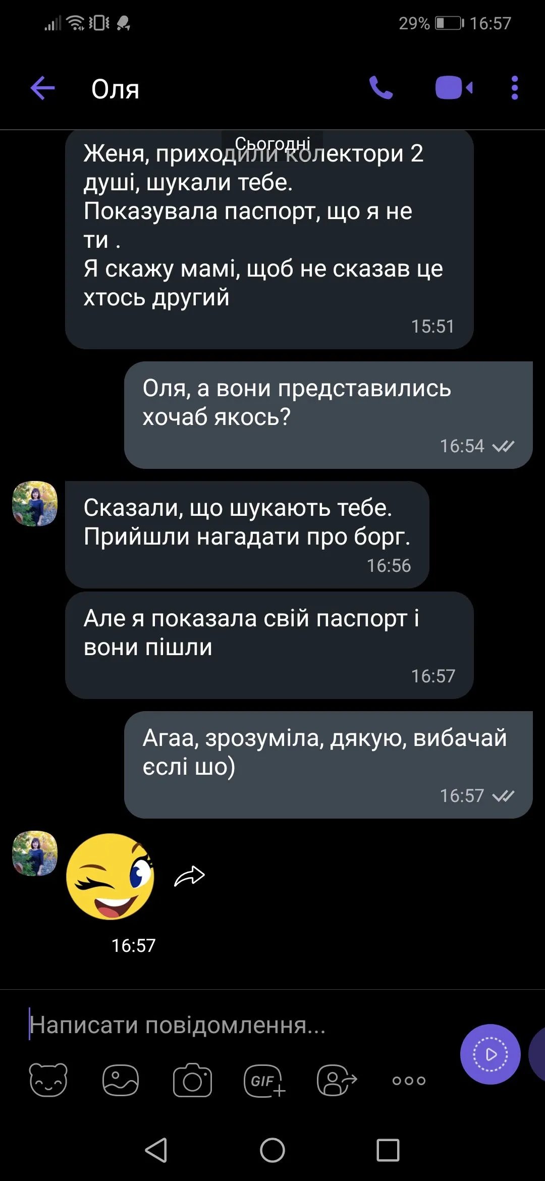 Всім привіт, в мене 7 мфо по всім просрочка більше місяці, номер телефону змінила, добрались до тата Є-гроши,був скандал, тато дуже хвилювався з приводу дзвінків, але номер не може змінити, поставила йому блокування, все наладилось, забули про них, по адресу реєстрації не проживаю давно, живу в іншому місті, прописана я в Києві, наразі квартиру здаємо в оренду, як приходять листи то квартирантка мені їх скидає, а от сьогодні пише що приходили колектори двоє, вона їм показала паспорт, і вони пішли, з якої шараги не запитала, от цікаво тепер хто це може бути?