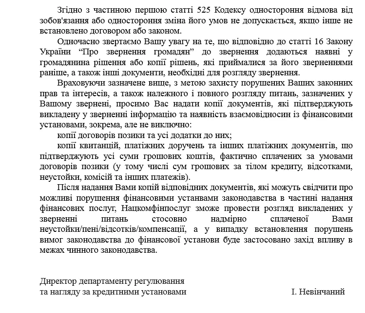 Доброго, а подскажите на какое мфо Вы писали ? Мне пришел ответ на ТОВАРИСТВОМ З ОБМЕЖЕНОЮ ВІДПОВІДАЛЬНІСТЮ “СЛУЖБА МИТТЄВОГО КРЕДИТУВАННЯ дословно "З метою повного та об’єктивного розгляду Вашого звернення Нацкомфінпослуг було направлено до Товариства вимогу про надання інформації та документів. Станом на дату надання відповіді документи від Товариства не надійшли до Нацкомфінпослуг. " продлили на 15 рабочих дней рассмотрение.Доброго времени суток. Пришел ответ от нацком. Вот скидываю скрин самого важного. Как я понял, они им даже не писали, не просили предоставить договор и прочие документы? Просят их от меня. У кого такое было? Что делать?