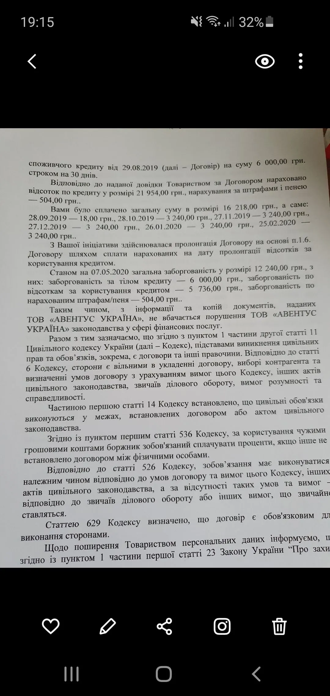 Вот что мне ответил нацком (коротко) - на тело 6000грн насчитали процентов 21954.00 из них я добровольно прологациями заплатила 16218.00 и на данный момент должна 12240.00, и они не видят нарушений???