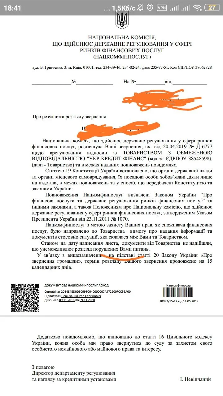 Может вас это успокоит - Договори між Товариством та Позичальни-ками було укладено відповідно до Правил (які відповідно до пункту 4.1 До-говорів є невід’ємною їх частиною) та Алгоритму згідно з якими Позича-льники після авторизації в ІТС Товариства (шляхом введення логіну та паро-лю) в особистих кабінетах погоджувалися з умовами індивідуальної частинидоговору шляхом натискання кнопки “ТАК”, що свідчить про невідповід-ність порядку прийняття (акцепту) Позичальниками пропозиції (оферти)Товариства укласти електронний договір визначеного абзацами другим татретім частини шостої статті 11 Закону, так як акцепт не був підписаний впорядку, передбаченому статтею 12 Закону.Оскільки ТОВ “МАНІВЕО ШВИДКА ФІНАНСОВА ДОПОМОГА”надано фінансову послугу Позичальникам з не дотриманням порядкуукладення електронного договору, встановленого статтею 11 та 12 Закону,Договори є такими, що не прирівнюється до договору, укладеного уписьмовій формі та в силу приписів статті 1055 Цивільного кодексу України,кредитний договір, укладений з недодержанням письмової форми, єнікчемним.Таким чином, ТОВ “МАНІВЕО ШВИДКА ФІНАНСОВАДОПОМОГА” надано фінансову послугу з порушенням частини першоїстатті 6 Закону України “Про фінансові послуги та державне регулюванняринків фінансових послуг”,
