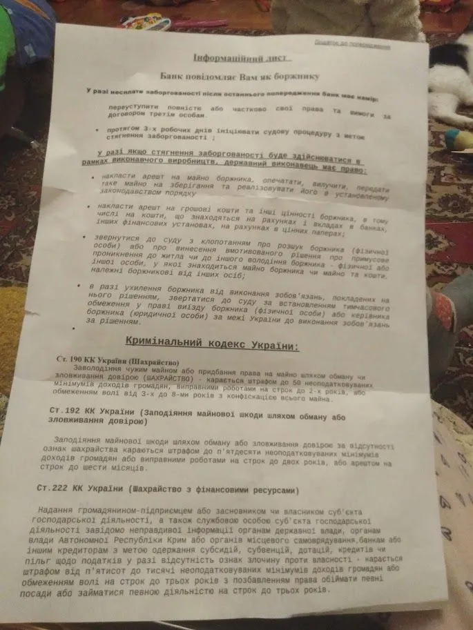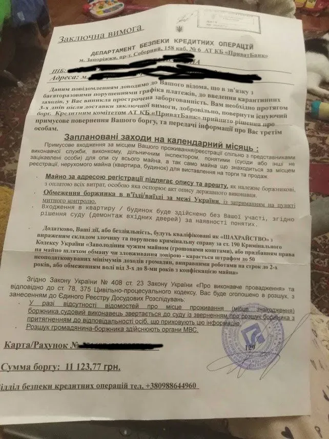 Здравствуйте,мне такое пришло письмо чудо,я не плачу почти полгода причина "мой ребенок попал в больницу очень серьезно и нужно купить лекарство у меня есть справка) мне звонили приват угрожают если я не заплачу 500 грн до 10 числа я сказала если 500 то уберут штрафы но не убирали и не собиралась платить только через суда!