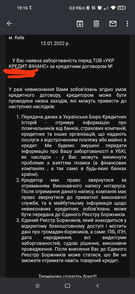 И мне сегодня тоже такое пришло на почту, только от их ещё одной конторы кредит касса. Что делать? Ничего, удалить и забыть. Работают по заученным правилам. Дальше ещё будут слать письма с угрозами, и по Укрпочта тоже.Вот пришло на почту.Чего ждать дальше?