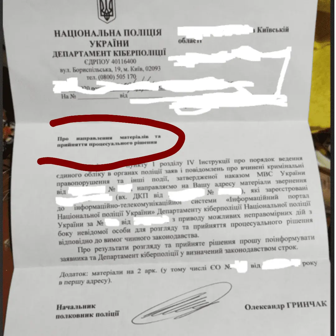 Обычный ответ, спустят на районное или местное отделение полиции, потом Вас вызовут и будете уже там все рассказывать, там где аркуш 2. то это только адресату тобиш полиции, там будут Ваши скрины если отправляли.