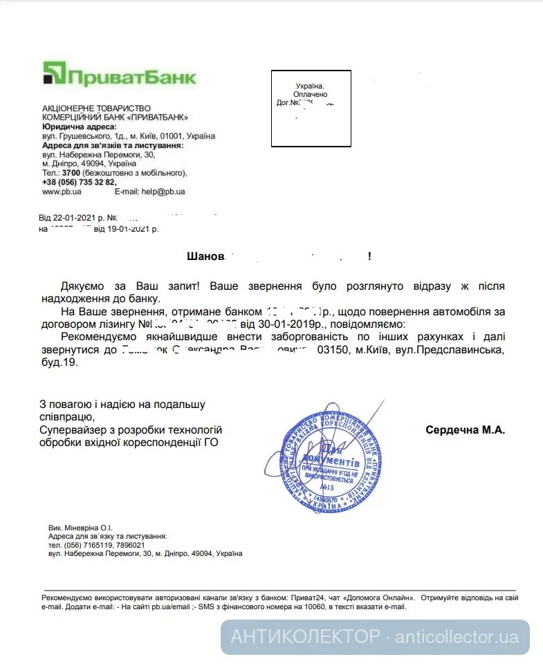 Обращение в банк (с уведомлением и описью вложения) отправила, вчера они его уже получили. Жду ответ. Но в Приват24 операторы предлагают оплатить все долги в других банках и тогда Приватбанк будет решать вопрос с машиной. На данный момент машина на штраф площадке, каждый день +38 грн.