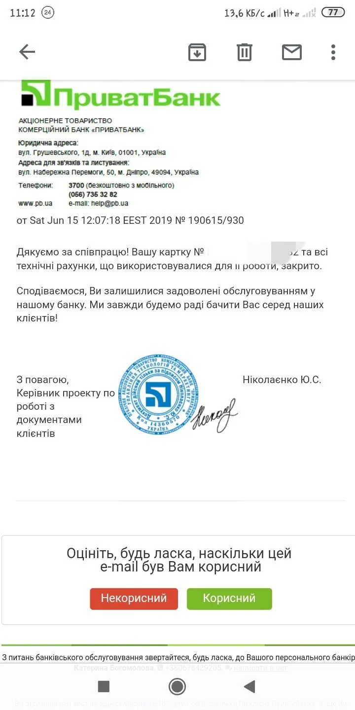 Сам только что закрыл, теперь можно спать спокойно. Ибо у самого 5 МФО, на них я сра** хотел с большой горы. А вот банку быть должником не охота! ПБ и справку прислал, что я больше не клиент их банка. Осталось закрыть кредитку и всё. IMG_20190615_112520.webp