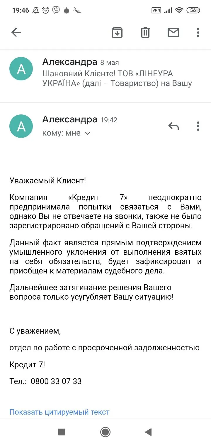 Мне тоже такие приходили. Потом приходили, что оформят ИН. Сегодня пишут У вас сьогодні 30 день просрочки,вам буде пред'явлена підозра у Шахрайстві згідно 190 ст. ККУ. Ви навмисно взяли кошти в компанії,щоб їх не віддавати. Очікуйте вирок.Здравствуйте.
