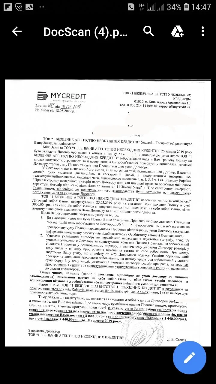 Просрочка почти 2 месяца,сначала морозился от них, потом решил закрывать мфо по одному позвонил им мне скинули електронный адрес куда написать, вчера написал седня пришол ответ. Написал своими словами что такую сумму платить им не буду сослался на закон Украины, и сегодня от них пришол ответ.яка просрочка, і шо ви з ними робили?