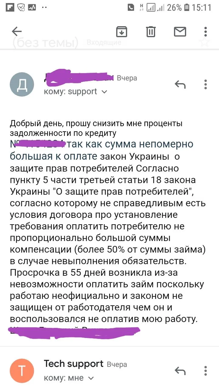 Я наприклад,не вмію писати своіми словами.Чи можете ви скинути зразок того,що саме ви писали? ДякуюПросрочка почти 2 месяца,сначала морозился от них, потом решил закрывать мфо по одному позвонил им мне скинули електронный адрес куда написать, вчера написал седня пришол ответ. Написал своими словами что такую сумму платить им не буду сослался на закон Украины, и сегодня от них пришол ответ.