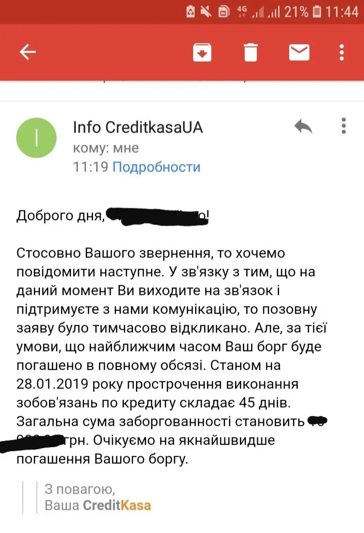Увага! В разі несплати боргу 9 096,73 грн або подовження 4 407,68 грн за кредитом 0087-9811, чекайте інспекторів за Вашою адресою проживання для з'ясування можливостей погашення боргу. Повідомлення відправлено Вам офіційним листом. Тисніть для сплати: creditkasa.com.ua/p?A879811. 0443335143 -- и так каждый день.