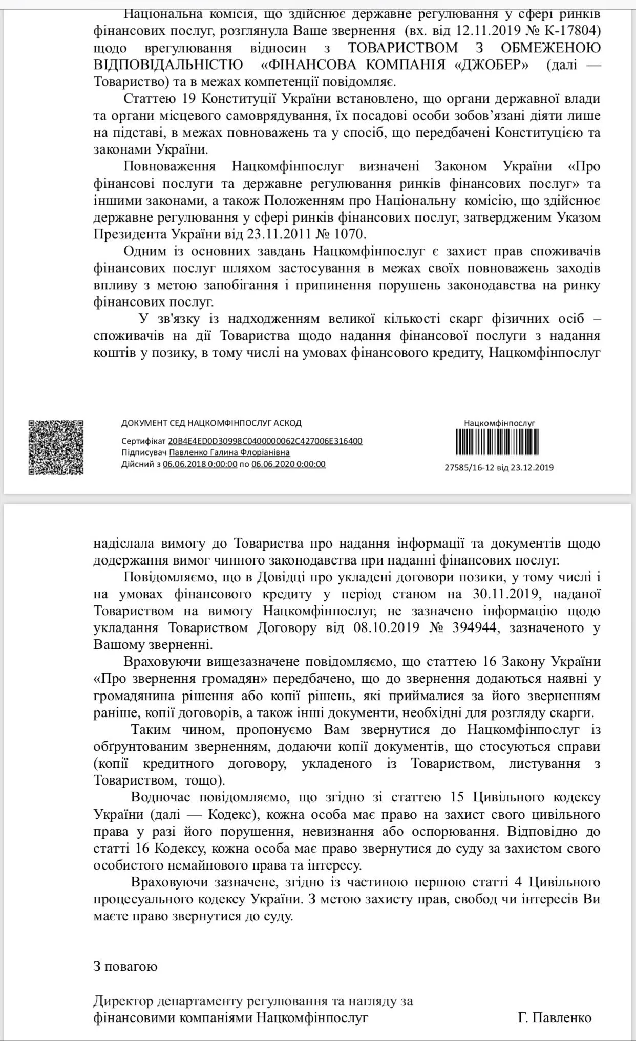 С какой Вы подавали обращение в Нацком?Не могу понять ответ договора нет скидывала скрин личного кабинета!Помогите пожалуйста