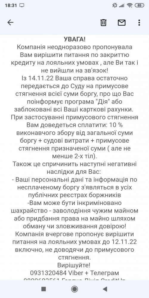 Реально, я закрив за тіло у квітні, тіло 5000, за 2 роки просрочки у особистому кабінеті сума була 132,672.00 тільки спочатку через гарантійкуМені прийшло такий саме лист, слово в слово . Перед ним было смс за тіло пропонували , всього 12 годин дали на оплату .Я не писала їм не знаю за тіло ,чи просто на зв'язок витягували .