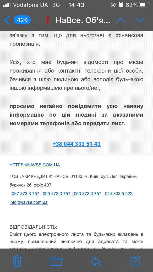 Сегодня прислали такое по электронке. Ещё такого не было, то они в суд подают, и в убки направляют отчёт. Теперь вот розыск...