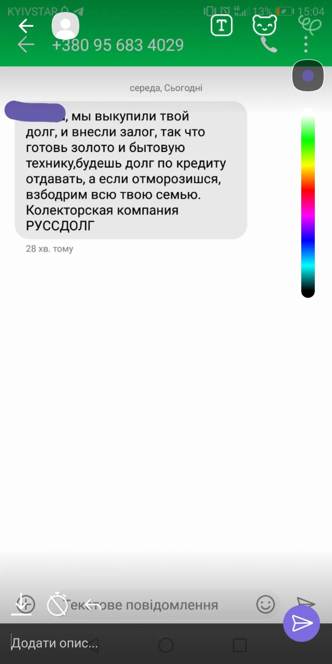 Это "Ваша готівочка" такой херней страдает))) нет таких калов) мне тоже от них приходила смс,месяца два с тех пор прошло,может чуть меньше и тишина..... ща скину че писали эти дебилоиды)?