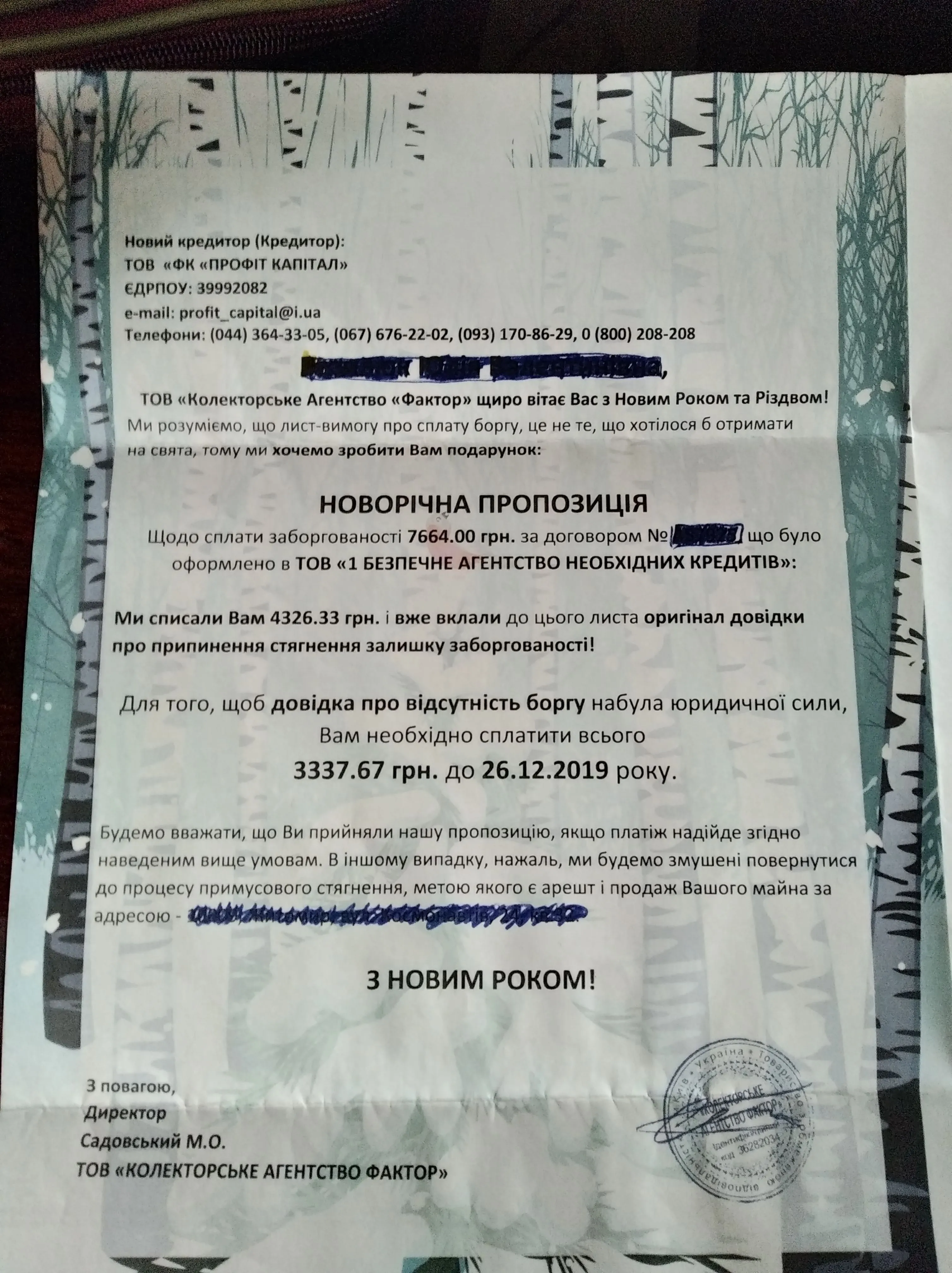 Если кому-то интересно, что происходит спустя 2,5 года просрочки, то скажу вам, приходят письма с новогодними предложениями на красивом бланке и в конверте со снигирями! Креативщики, блин))):кофе::кофе::кофе: