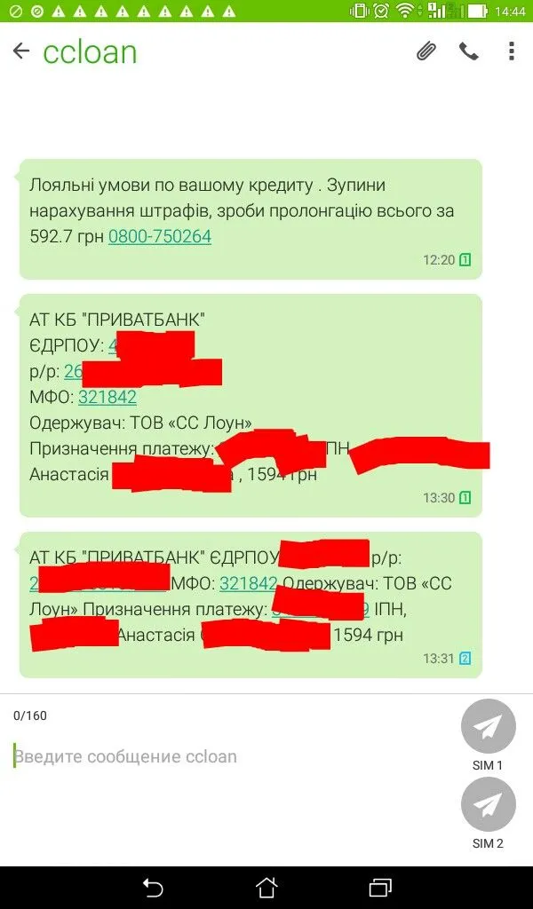 Я брала у Сcloan, просрочка примерно дней 15 , брала 1000. Сегодня Пришла мне вот такая смс : ( скрин ) Позвонили моей сестре и сказали что я должна Приват банку 1,500 . Я сказала это мошенники , она же им отвечает что меня не знает. Что то я начинаю паниковать.. Пожалуйста, кому приходило такое , поделитесь опытом ) Спасибо