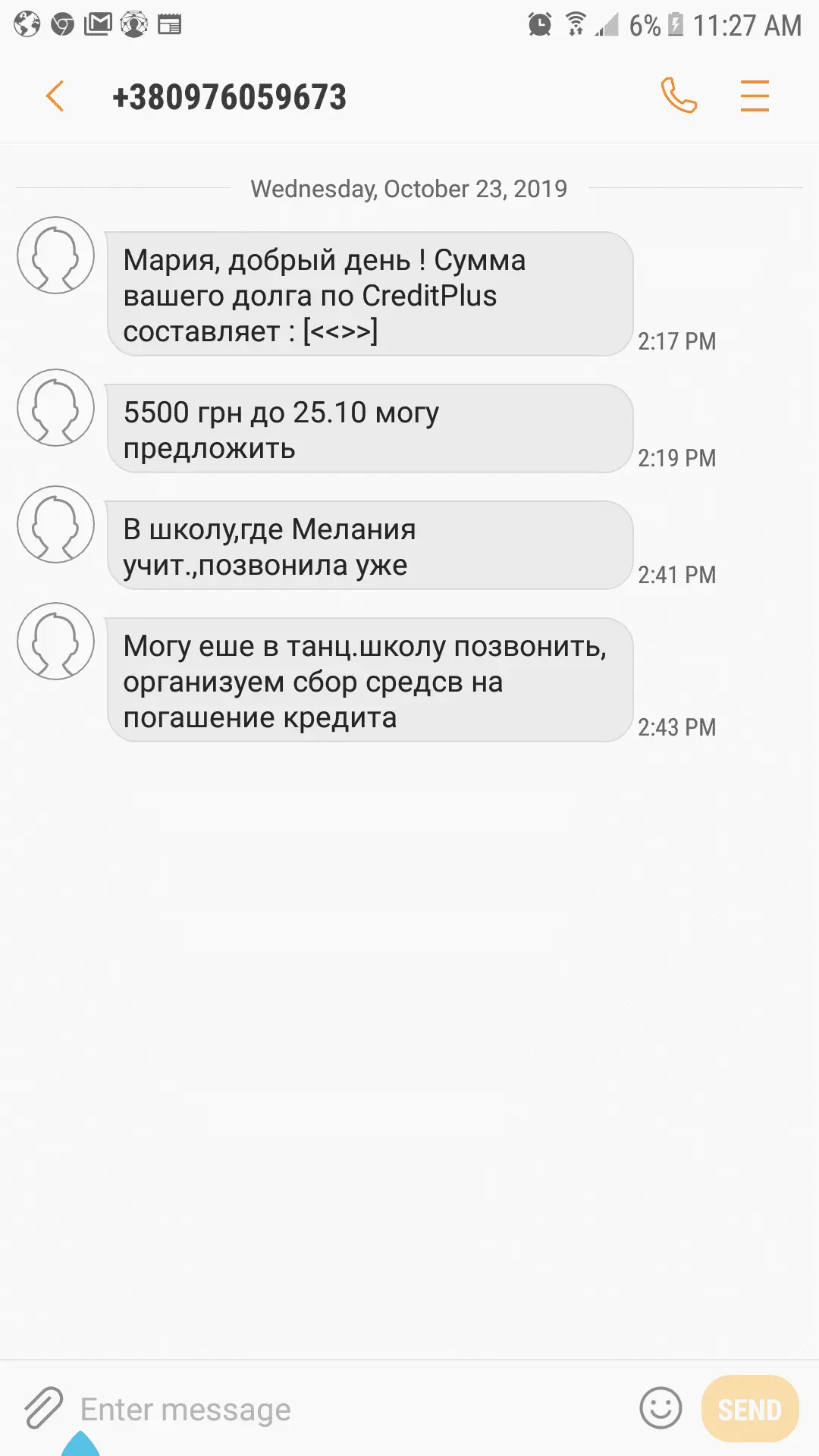 а як реагувати на повідомлення вайбер з російських операторівДавайте посмотрим на ситуацию со стороны. Звонок в школу. Здравствуйте, такая то такая должна денег. Реакция директора.1. Пошлет 2. Скажет Вам.Теперь вопрос. И что? В первом варианте вам то что? Второй вариант- да, было дело, давно рассчиталась, потом всплыло ещё непонятно что, сейчас мой юрист ведёт с ними переписку, если не угомонятся, буду подавать в суд. Извините за неудобства. Не смертельно? Нет,и даже не стыдно,т.к. каждый третий в своей жизни попадал в разные непонятки. А то и каждый второй. Вывод- вы слишком накрутили серьезность этой ситуации.