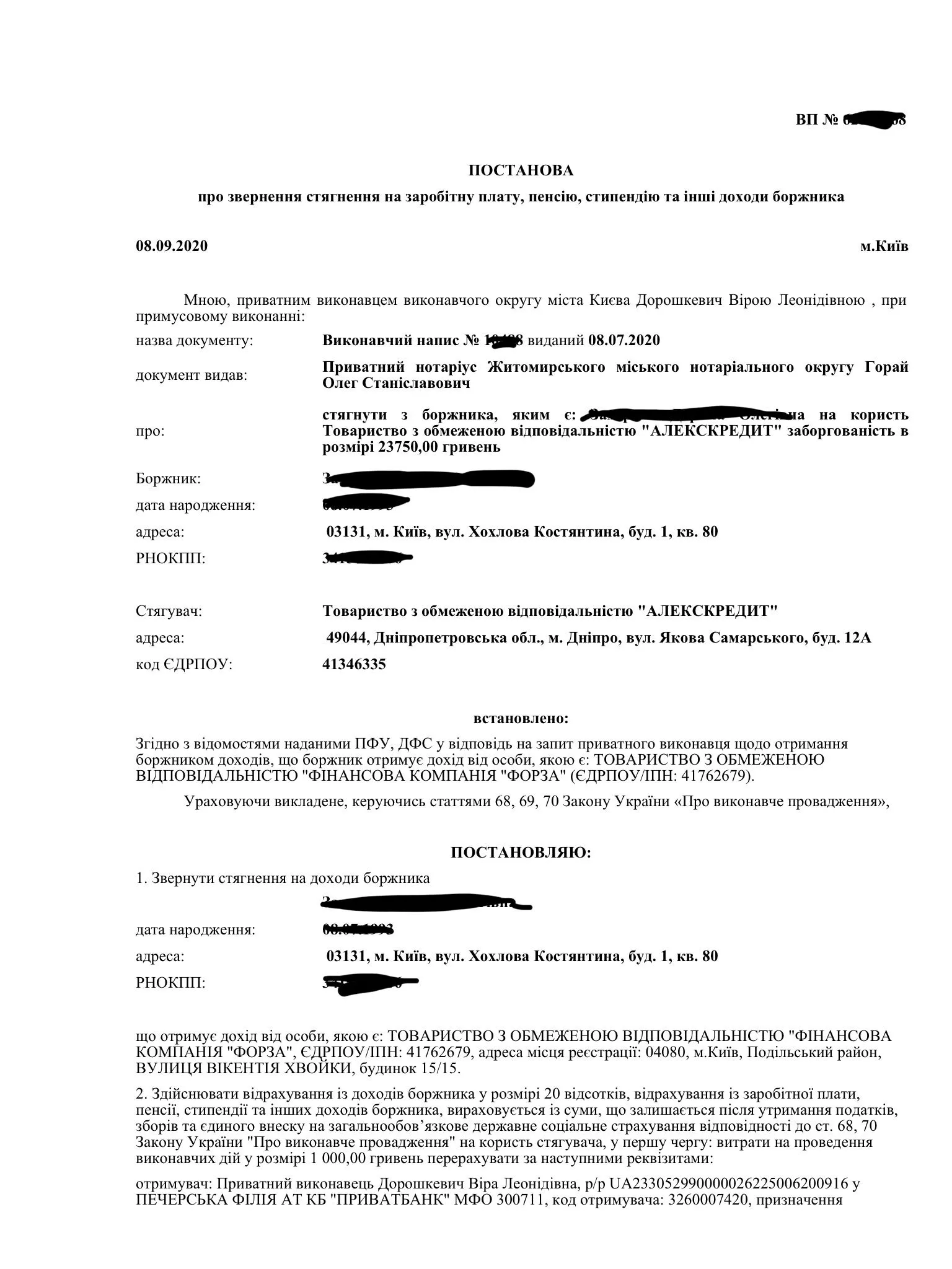 И постановлением решено стягивать доход в размере 20%, который я "получаю" в Финансовой компании "Форза". Эти данные им "выдали" ПФУ и ДФС.