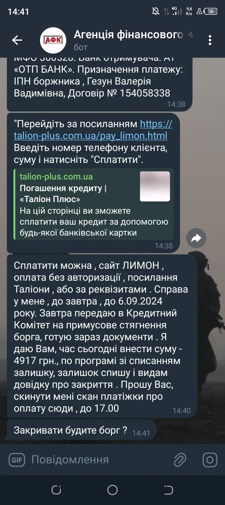 Але почали телефонувати знайомим дуже не присмна ситуація але зараз не можу погасити борг вони з 2х тис грн нарахували вже 8000 тис грн , я сама з трьома дітьми , чоловік захищає нашу землю і що робити просто не знаю дуже страшно , в одно час почитала тут багато інформації але все одно страшновато .
