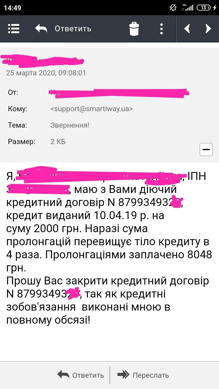 тело было 2000,год делала пролонгации, стремно было из-за рассылок, ведь работаю в школе и есть куча номеров учеников и родителей! писала на них в нацком по поводу переплаты, но месяц ответа нет и в приложении ни чего не менялось! и я сегодня решила написать на електронку смартивей, что кредит я переплатила пролонгациями, так что закрывайте! через час мне ответили что со мной свяжется специалист, но так ни кто и не звонил, и вот сейчас зашла в приложение и написано кредит закрыт и я могу брать новый! так что написала снова на електронку что справку о закрытии прислали! и потом в нацком напишу еще раз на возврат переплаты, мож повезет!!!!