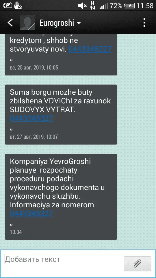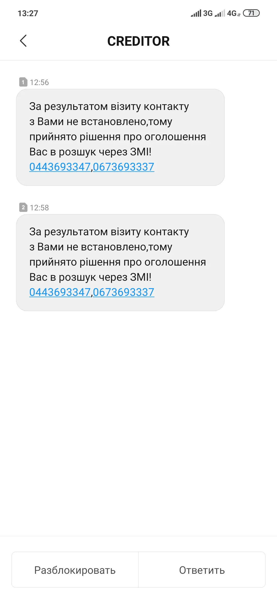 ..всем доброе утро!получила смс Якщо протягом двох годин оплата за кредитним договором № не надходить,документи будуть направлені Начальнику виїзної групи. Что скажите?это просто угроза?