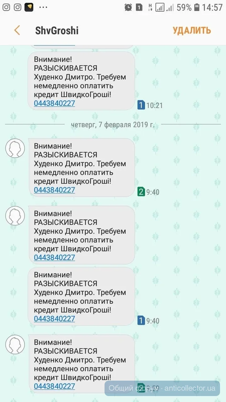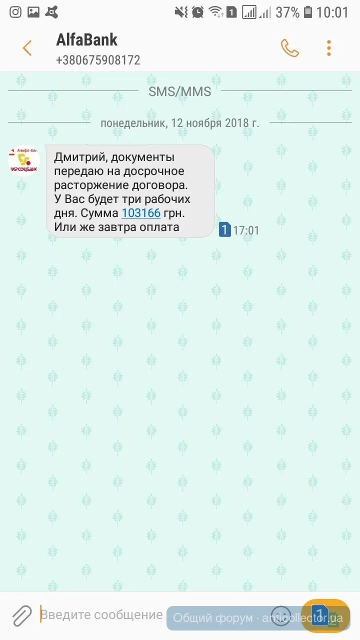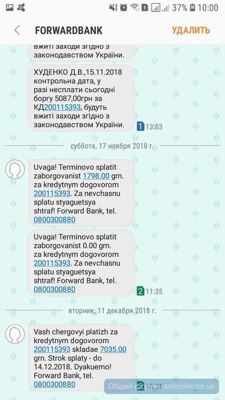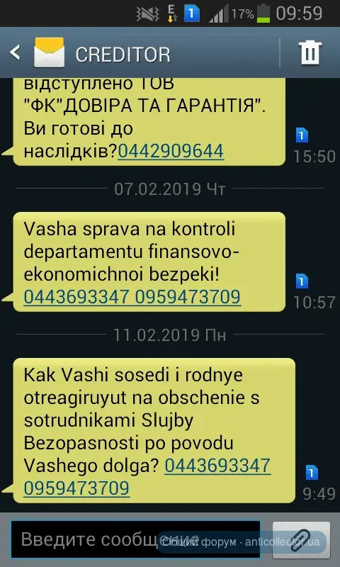 Финфорс звонили ,так грубовато попросили уплатить ,я сказала как только будут деньги уплачу тело,дальше переписка смс,предупреждения,что все может плохо закончиться.В итоге я сказала,что адвокат попросил,чтобы прислали документ подтверждающий переуступку долга с печатью и подписью.Передали привет адвокату и с 20 числа тишина.Укр кредит финанс присылали мне подобное еще в октябре. А сейчас, как только про адвоката сказала, так они бедные не знают чем напугать,чтоб заплатила. Сказали завтра в полицию отнесут заявление о мошенничестве. А заявление на себя наверное писать будут.лошары)))))