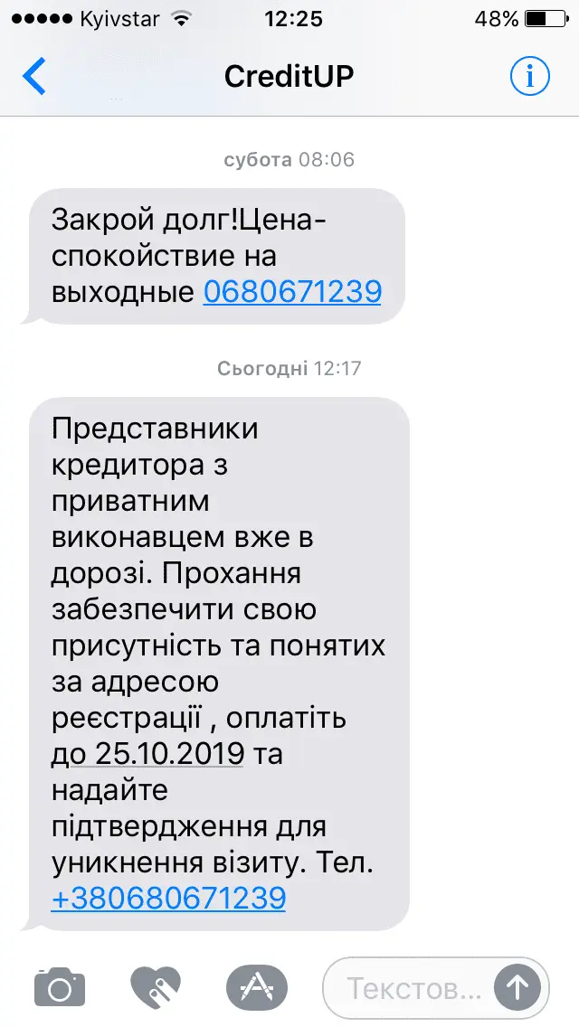 Да пипец какие грозные)) "заплановано арешт майна та банківських рахунків на 28.10.Манивео.0966354835" от них же..)Ага, как будто бы коллекторы))) писаки грозные...