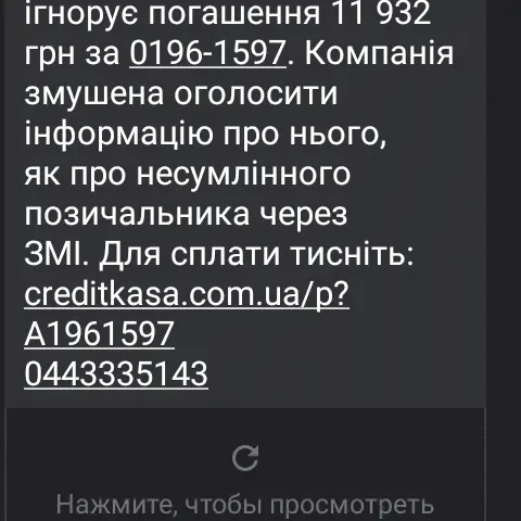 В нашей финансовой компании crediton.ua у Вас просрочка сроком больше полугода, тем не менее сумма была заморожена и списана до минимальной. Все документы о списании и закрытии кредита будут высланы Вам на ближайшее отделение почты, так же будет передана информацию в УБКИ о закрытии Вашего кредита. Для получения реквизитов и суммы для оплаты свяжитесь с отделом списания: Viber 380666853207, горячая линия 0634672637, 0671195610, 0503714580, 0800330273