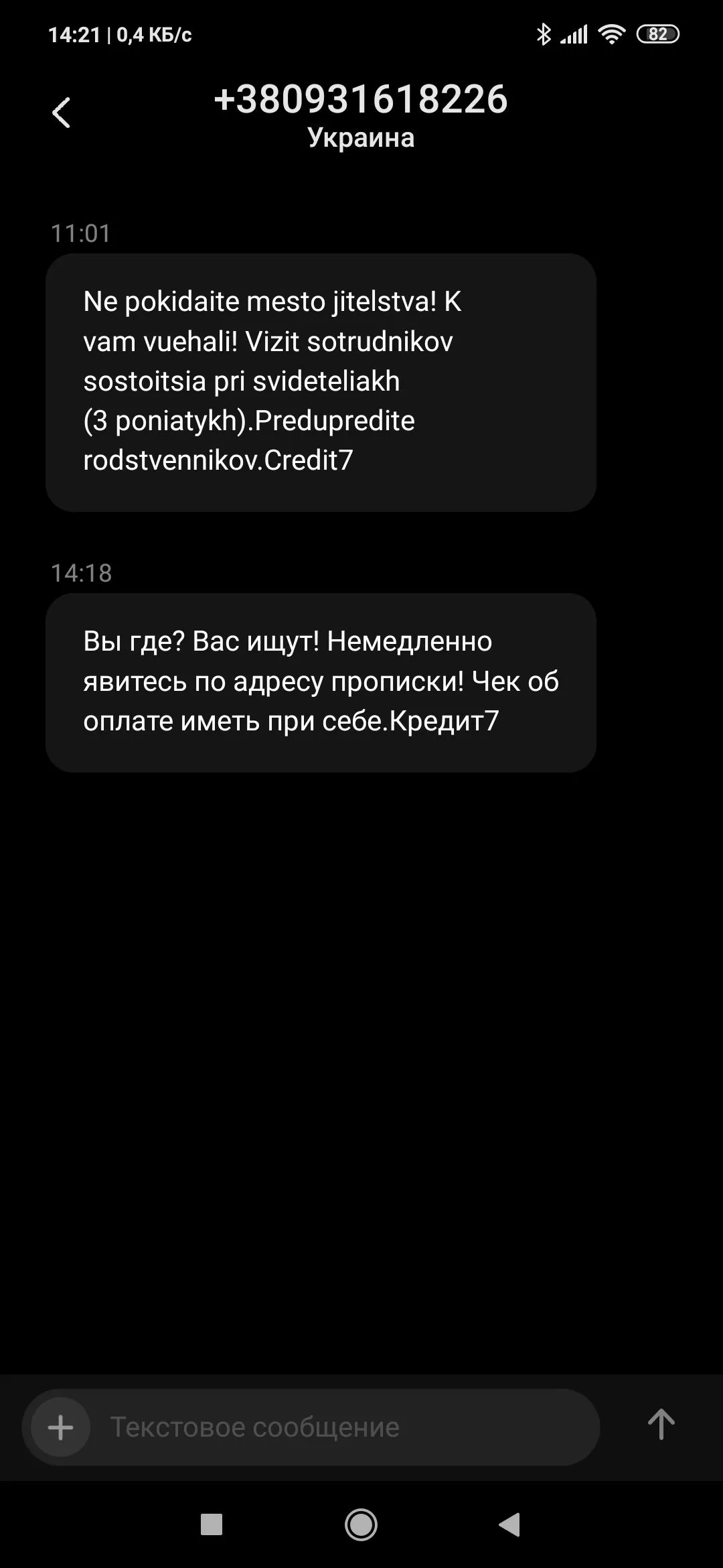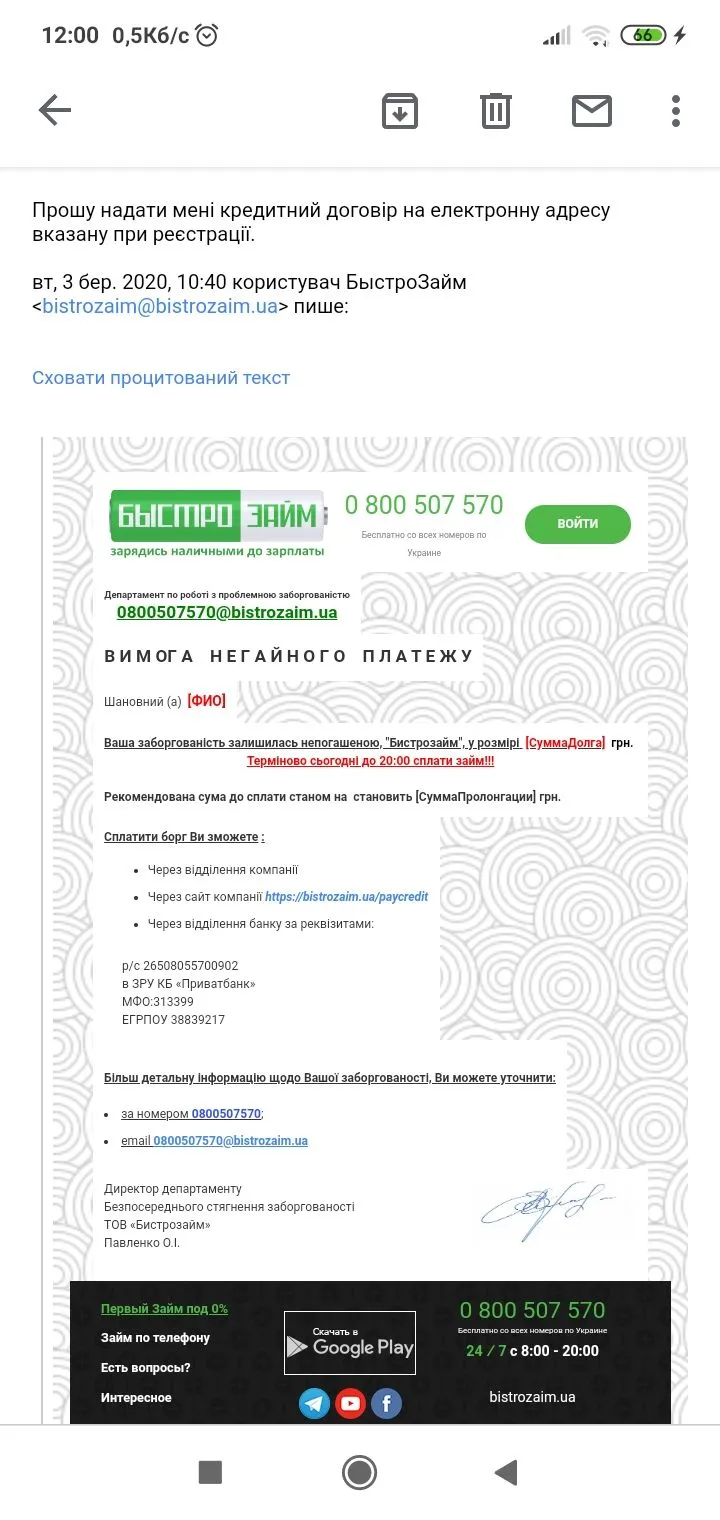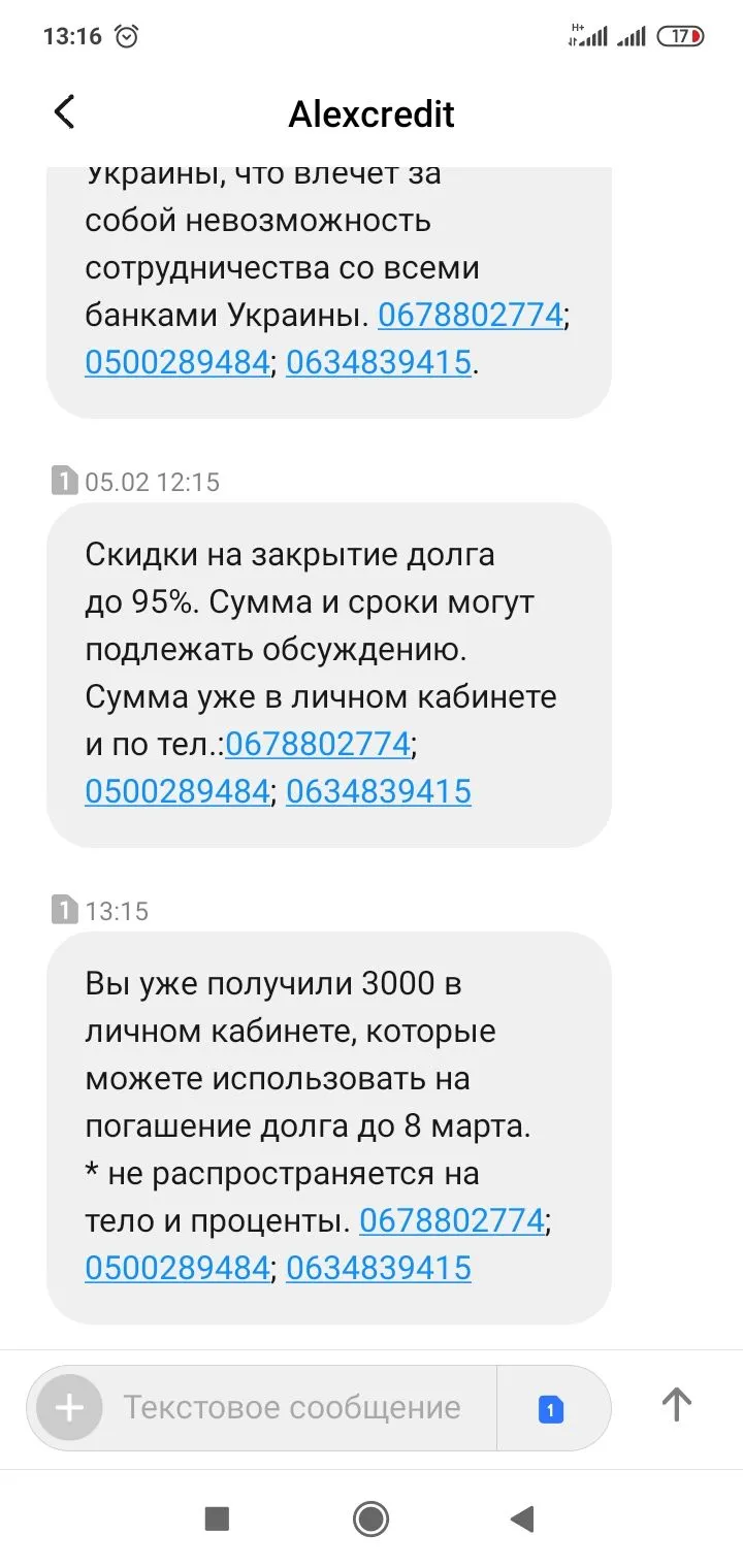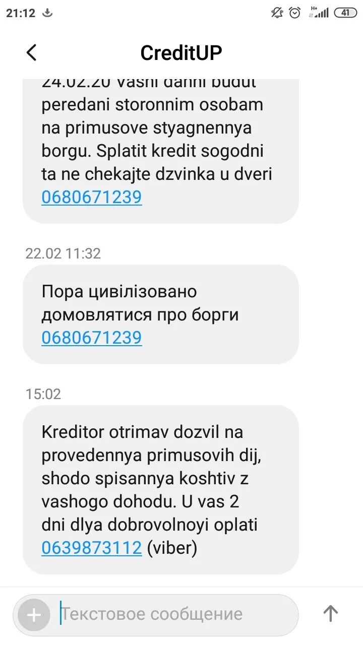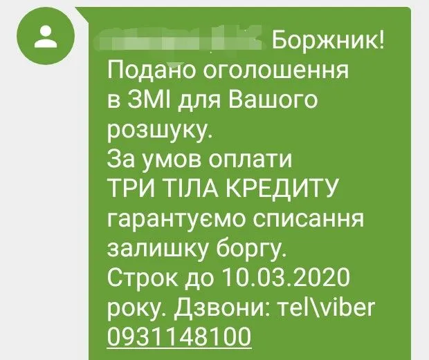 Бред полный. Не ведись.Пришло вот такое сообщение. Vnimanie! V vidu ignorirovaniya Vami pogasheniya kredita v kompaniyu Ukrpozyka LC, my' vy'nuzhdeny' oglasit' informaciyu o Vas, kak o nedobrosovestnom zaemshhike cherez SMI. Detali: 0 800 50 0755