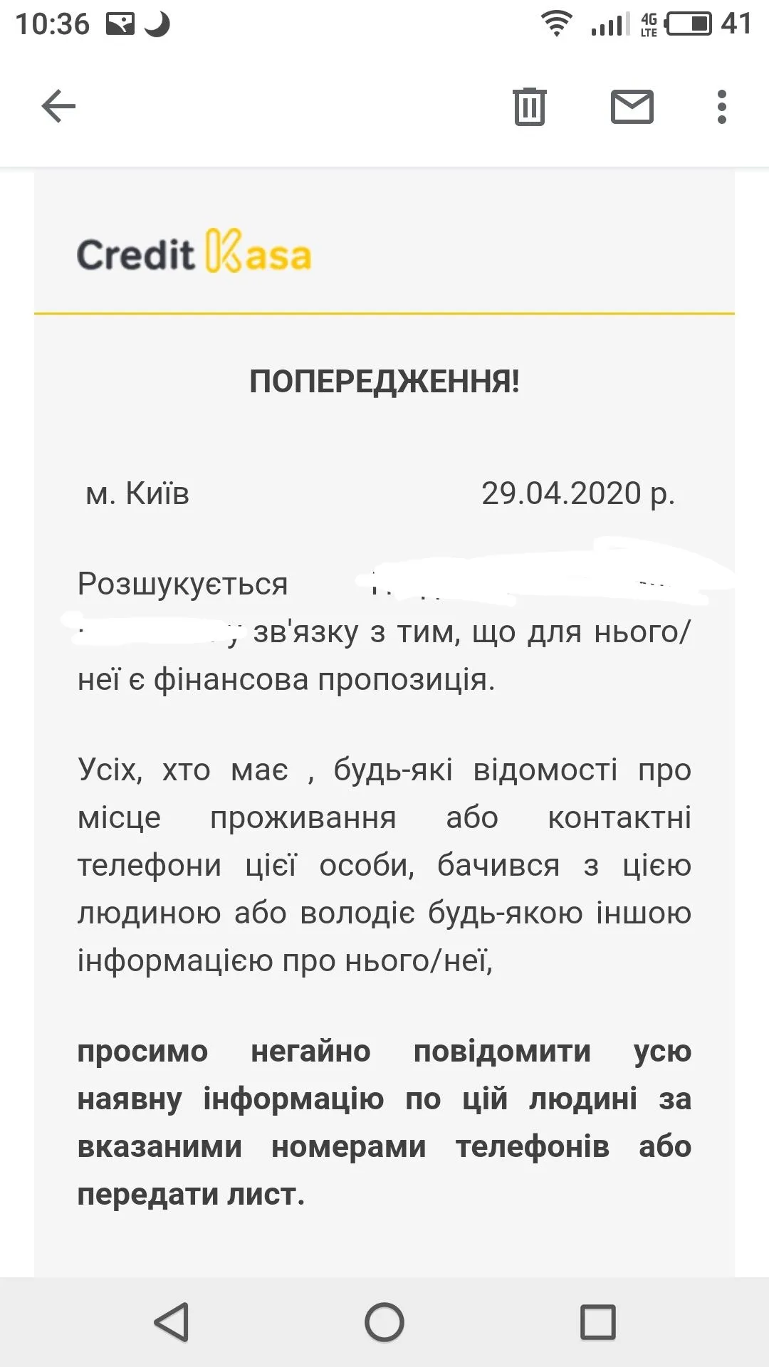 А вы с Киева?Компанія розриває кредитний договір і робить переуступку прав вимоги ст.1077ЦК так само передаються всі ваші дані! Попереджаємо! За дії цієї компанії ми відповідальності не несемо.