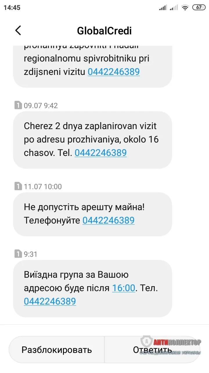 Ви в маршрутному листі для з'ясування вашої платоспроможності. Підготуйте всю суму і чекайте на нас. Рекомендуємо перебувати за адресою. Відповідальний за виконання Таліон+ 0800215017
