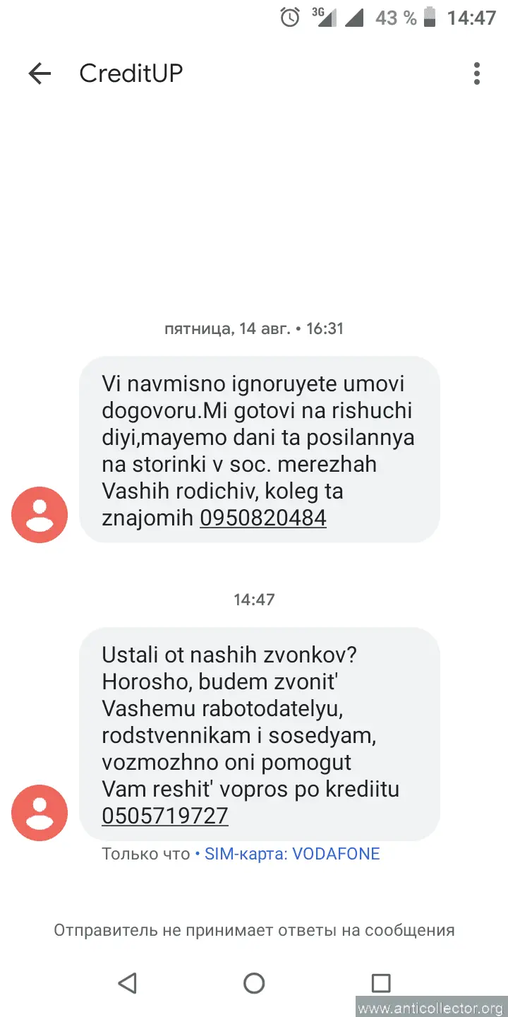 мне вот рыжие апы вот такое шлют)Dovgij chas Vi navmisno ignoruyete umovi dogovoru.Mi gotovi na rishuchi diyi,mayemo dani ta posilannya na storinki v soc. merezhah Vashih rodichiv, koleg ta znajomih. 0994961540 viber.