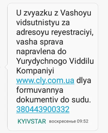 Лист-претензію вже доставлено за Вашою адресою. У Вас мало часу. ТЕРМІНОВО ЗВ’ЯЖІТЬСЯ viber://add?number=380633036811 або 0800605672