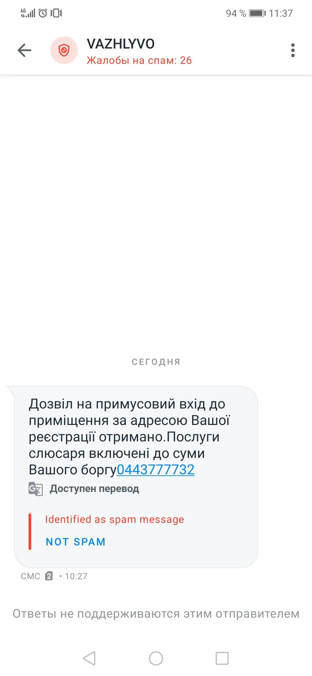 Всем привет , вот мне сегодня пришло что - то новенькое !!!Как это уже за...ло , вот чесно! "Дозвіл на примусовий вхід до приміщення за адресою Вашої реєстрації отримано.Послуги слюсаря включені до суми Вашого боргу0443777732" Не могу вообще понять кто это , что это ????