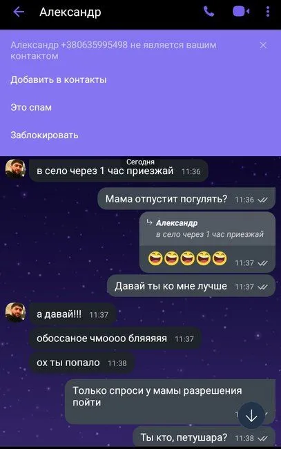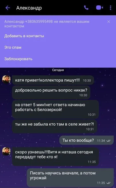 Мне сегодня в вайбер написал какой-то Александр (0635995498), и такой дружбан: катя, привет! коллектора пишут!!! добровольно решить вопрос никак? на ответ 5 мин.! нет ответа начинаю работать с ...... (название села). ты же не забыла кто там в селе живет?!