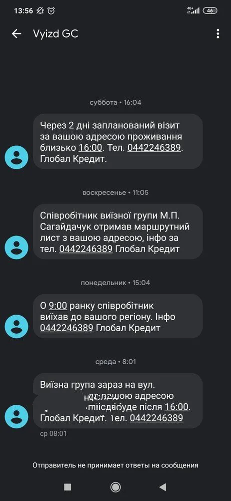 Через 2 дні запланований візит за вашою адресою проживання близько 16:00. Тел. 0442246389. Глобал Кредит.