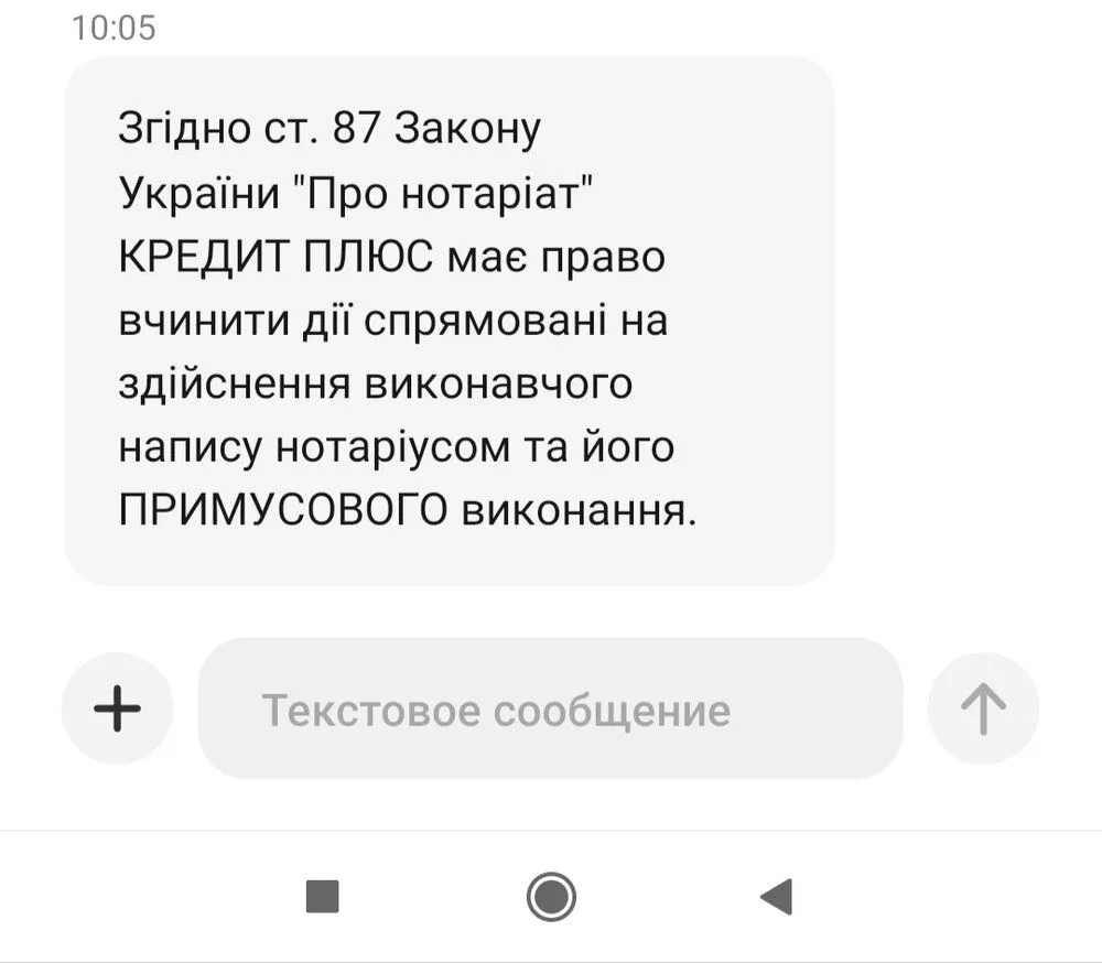 Добрий день. Я тут новенька. В мене невелика просрочка ще, але дзвонять всім. Я спочатку ішла з ними на контакт але зрозуміла що від цього немає ніякої користі. Люди не чують. Ось сьогодні прийшло таке смс. Чи можливо таке? І що далі чекати?
