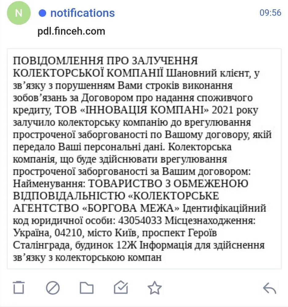 У разі виникнення будь-яких питань стосовно вашої заборгованості Вам необхідно звернутись до Вашого нового кредитора - ТОВ ФК "КЕШ ТУ ГОУ" за тел.: +38 044 334 36 90 або на електронну пошту [email protected]