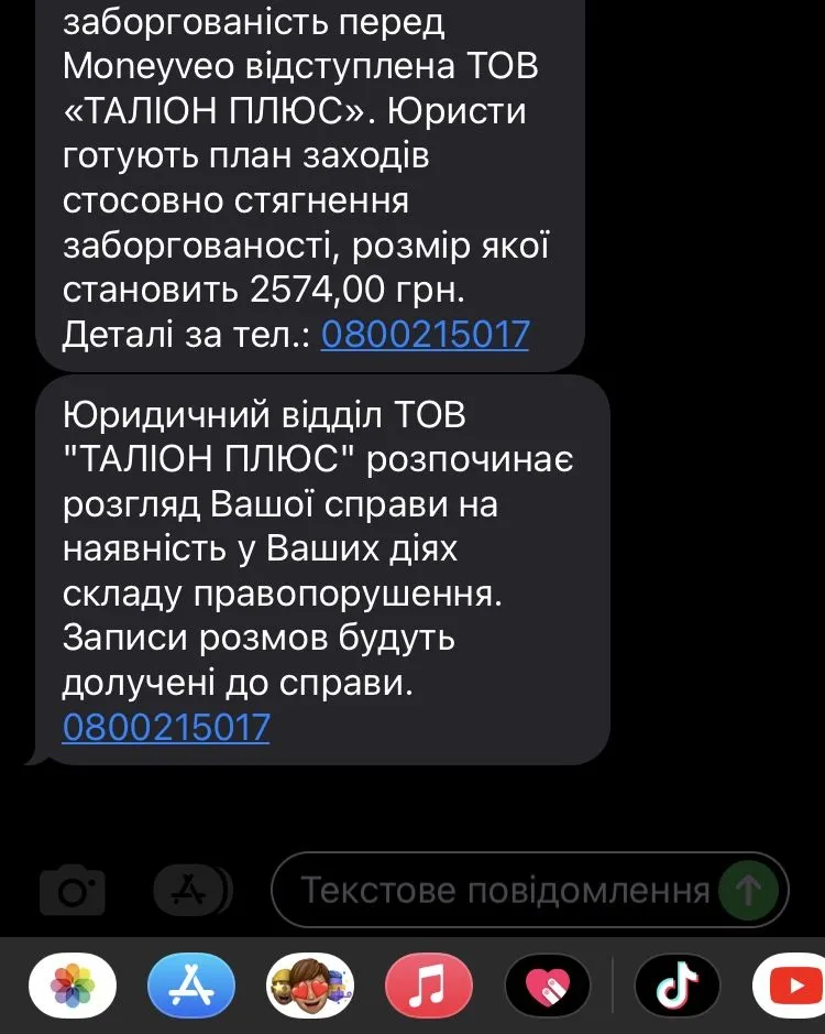 Доброго вечора. Сьогодні отримала смс. Документи за Вашим договором передані до юридичного відділу ТОВ "ТАЛІОН ПЛЮС" для розгляду справи на наявність у Ваших діях складу правопорушення. 0800215017.