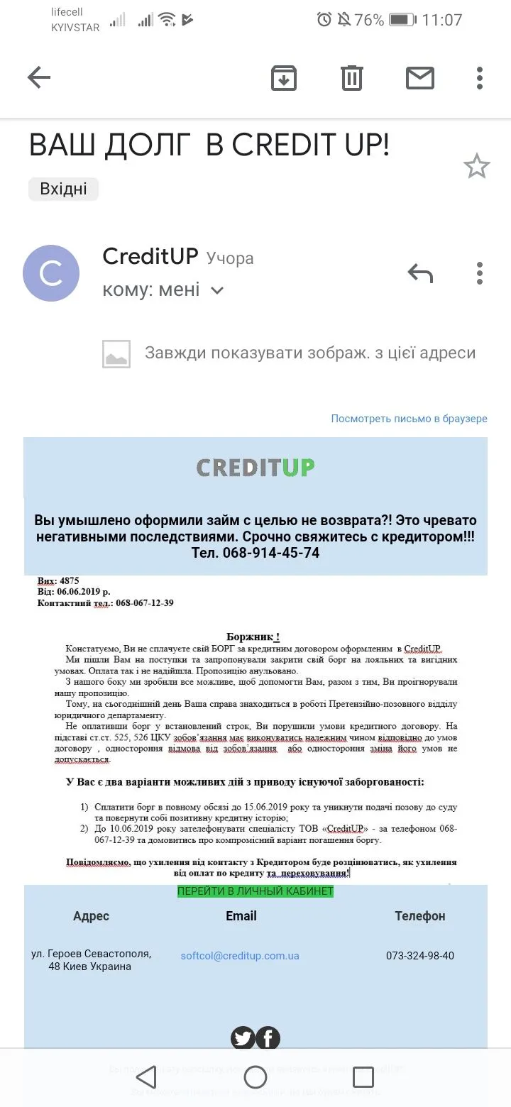 Tetiana, Ирина 345, не помню не заходил давненько , ну около полугода наверное. Не хамили не грубили ниразу , угроз не поступало вроде . Один раз сам звонил когда прислали смс что отдать только тело , но там сумма на 3-4 тыщи больше , сказал набрать меня когда считать научатся :) да и зачем туда заходить если денег не дают )
