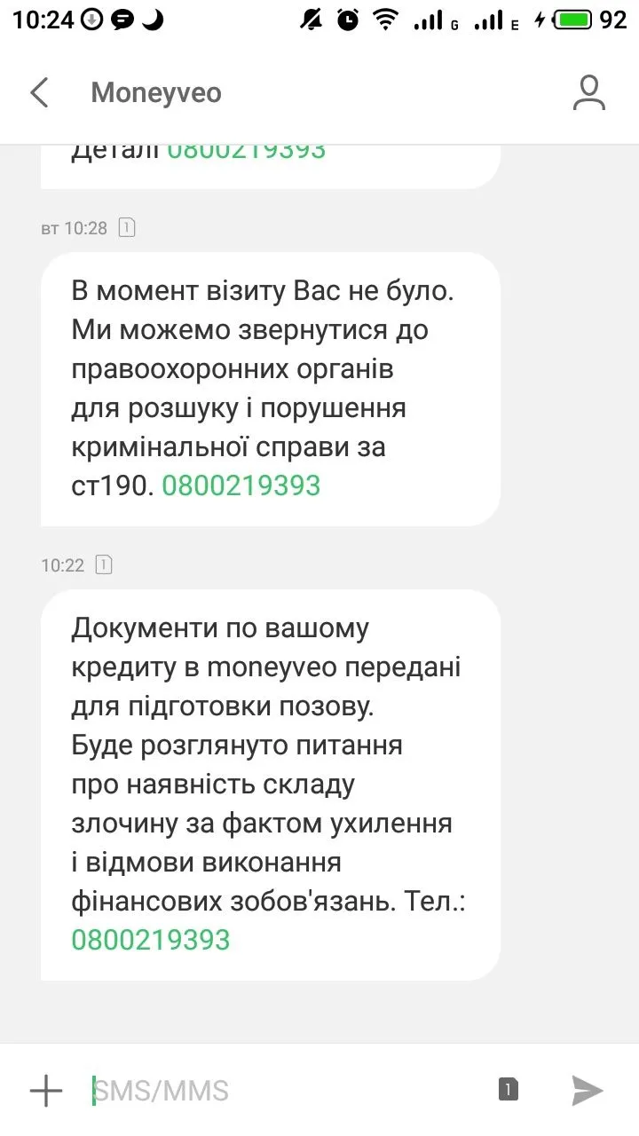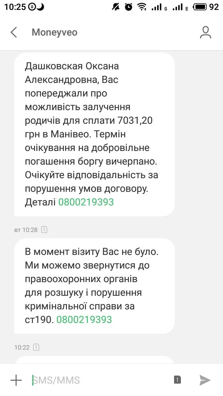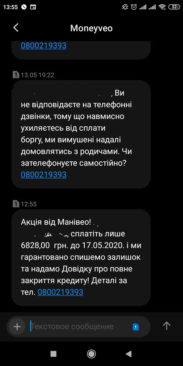 В мене щось схожу було,але розсилку смс зробили по цілому будинку 152 квартири) в даному будинку я був колись прописаний років 10 тому))Потім за 3 дні всіх обзвонили і дали всі дані про мене номер телефону (тел на контракті) ,номер квартири,озвучили суму боргу і навіть номер паспорту продиктували який як 2 роки не дійсний(зробив собі ід) ,через декілька днів до мене подзвонив голова ОСББ і повідомив мене про це, я особисто приїхав до будинку де мене чекав дільничий в якого було 120 заяв на маніків від майже всіх сусідів,а також близько 42 записаних розмов.В той же момент я написав також свою заяву на них та прикріпив смс і запис розмови де калл напряму говорить що компанія манівео добереться до всіх родичів сусідів і знайомих і ось вже тоді я їм ще доплачувати буду щоб вони відстали від мене)))В ітозі всі заяви і доки зліпили в 1 справу якій вже дали хід.(Всі заяви були написані не на каллів а на директора компанії і на саму компанію)В результаті вже тиждень нечути про них,на їхню вхідну лінію не можу позвонити, каже що ви не можете здійснити цей дзвінок))На днях дзвонили з поліції сказали що вже відкрили кримінальне провадження)Сьогодні дзвонив з іншого номера до них сказали що мене не знають і ніяких договорів зміною не заключали.В ЛК зайти не можу пише неправильний логін чи пароль?