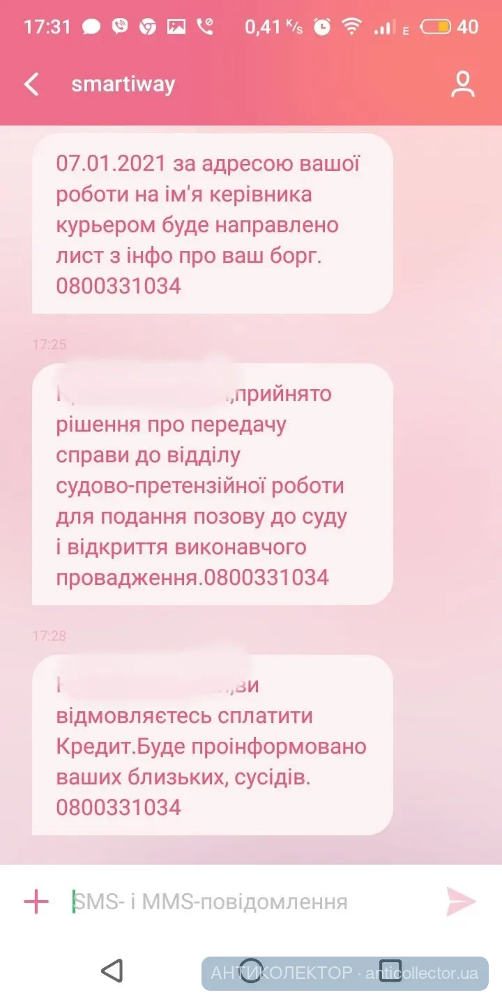 смартівей чого ще ждатьА Вы у них спросите на основании чего они собираются нарушать Закон информируя 3 лиц о Вашем кредите и беспокоя людей которые с ними не состоят в правовых отношениях