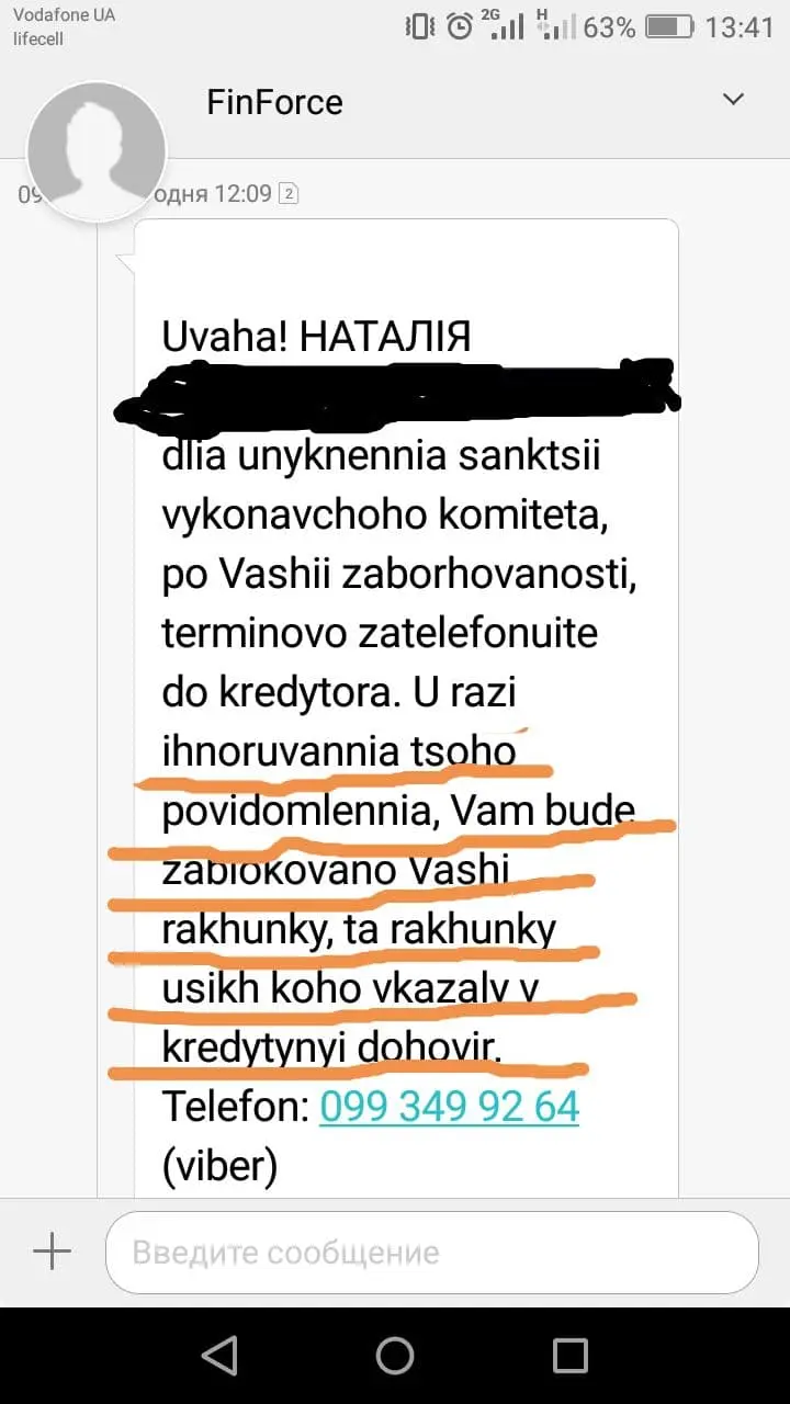 Добрий день шановні. Сьогодні в мене звичайний і водночас емоційно насичений день, 5 листів з Укрпошти, незлічена кількість СМС, дзвінки - вже давно ні на що не реагую. Але ось ця СМС трішки вивела з рівноваги. Розумію, що це звичайна розсилка, але черв'ячок сумніву гризе. Найбільше цікавить, через який час ФінФорс робить виконавчий напис і блокує рахунки.