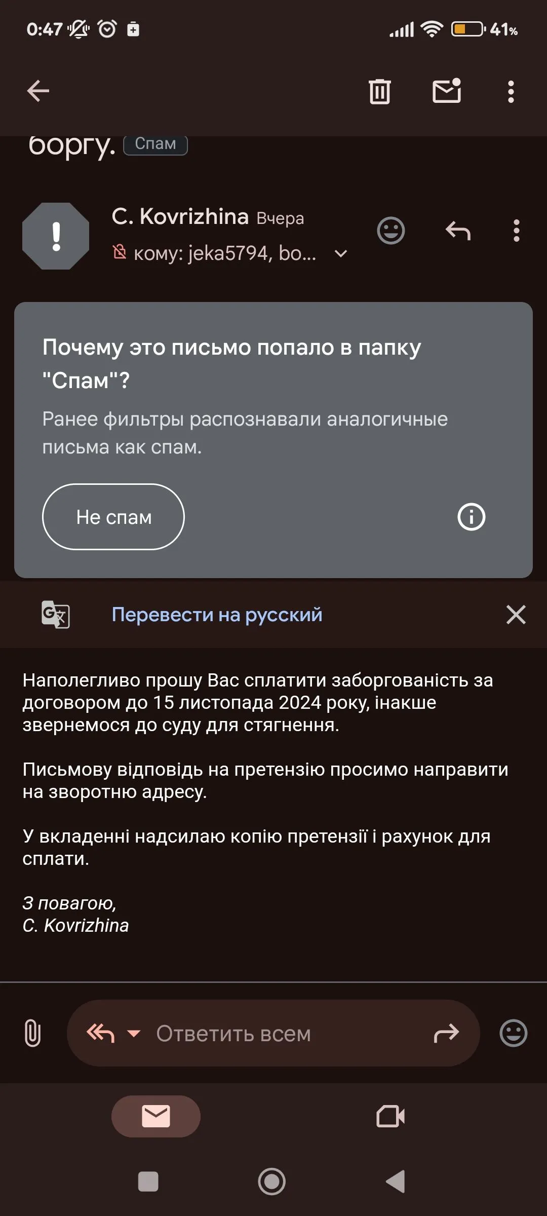 Открыла почту,в папке спам странная досудовая претензия,скачала,но открыть не смогла...от того и кто такие и сколько хотят без понятия....тел почистила,вирусов нет...но странно....и тоже оплатить до 15 числа🥴🤷