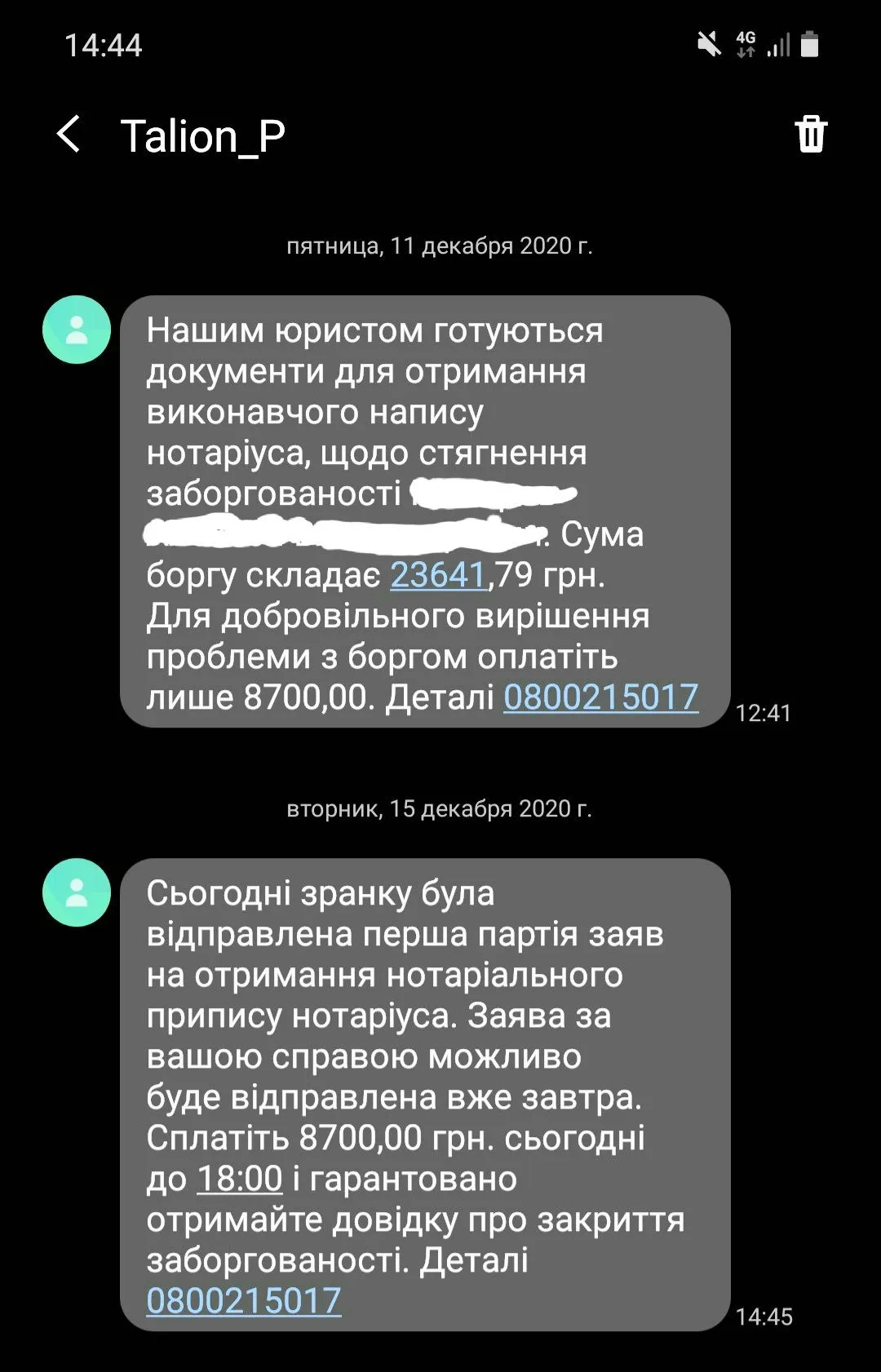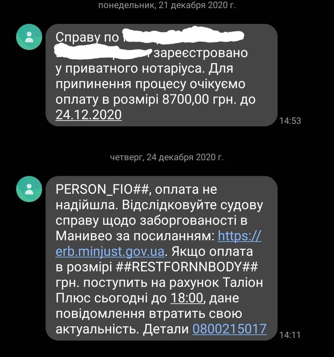 Кому то приходило такое смс? У них что предновогоднее обострение? Что то страшновато.PERSON_FIO##, оплата не надійшла. Відслідковуйте судову справу щодо заборгованості в Манивео за посиланням: erb.minjust.gov.ua. Якщо оплата в розмірі ##RESTFORNNBODY## грн. поступить на рахунок Таліон Плюс сьогодні до 18:00, дане повідомлення втратить свою актуальність. Детали 0800215017