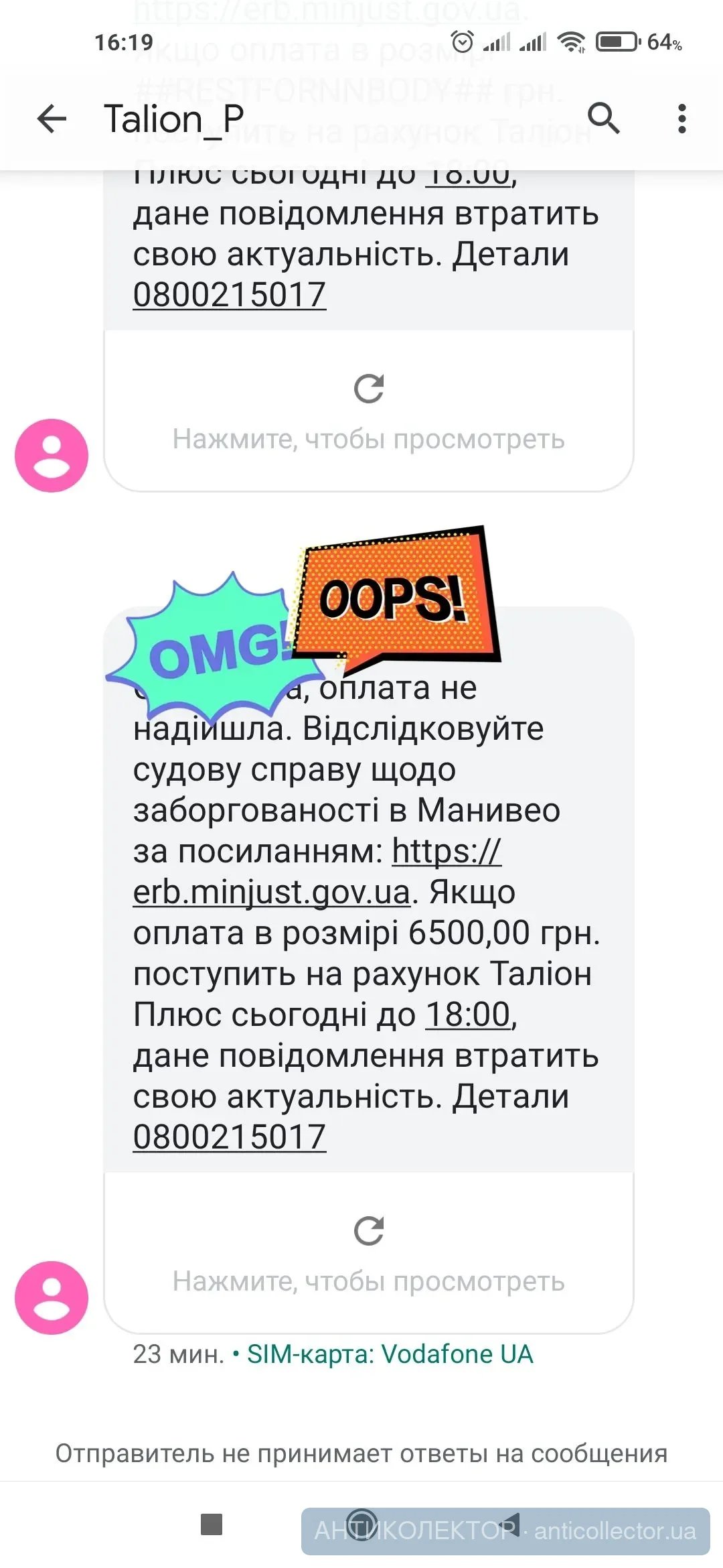 A якщо всім однакова смс, то це може просто смс розсилка, чи дійсно всім купою вліплять нотаріальних напис? Только что пришла новая смска оплата не надійшла. Відслідковуйте судову справу щодо заборгованості в Манивео за посиланням: Єдиний реєстр боржників. Якщо оплата в розмірі 11000,00 грн. поступить на рахунок Таліон Плюс сьогодні до 18:00, дане повідомлення втратить свою актуальність. Детали 0800215017